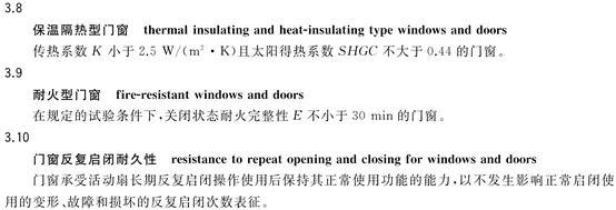 1) 第1章范围中增加了“本标准不适用于防爆门窗”(见第1章); 本标准规定了铝合金门窗的分类和标记、要求、试验方法、检验规则、产品标志及随行文件、包装、运输和贮存。 本标准适用于手动启闭操作的建筑外墙和室内隔墙用窗和人行门,以及垂直屋顶窗。本标准不适用于天窗、非垂直屋顶窗、卷帘门窗和转门,以及防火门窗、防爆门窗、逃生门窗、排烟窗、防射线屏蔽门窗等特种门窗。 【解读】: 防爆门窗是具有防爆炸冲击波性能的门窗。本标准不适用于防爆门窗,则本标准的产品不需执行GB/T29908-2013 《玻璃幕墙和门窗抗爆炸冲击波性能分级及检测方法》。 2) 第1章范围中删除了“非手动启闭操作的墙体用门、窗以及垂直天窗可参照使用”(见2008年版第1章); 【解读】: 根据标准编写要求,标准自身不再规定哪些产品可参照使用,由相关产品使用方自行分析和确定本标准是否适用其它产品。 3) 删除了“遮阳性能”“遮阳系数”“型材截面主要受力部位”的术语和定义(见2008年版的3.2、3.3、3.7); 【解读】: 采用国际上通行的方法,本标准采用太阳得热系数代替遮阳系数作为衡量透光围护结构(门窗或透光幕墙)热工性能的参数。故删除了“遮阳性能”和“遮阳系数”。按照国标GB/T 5237-2018《铝合金建筑型材》关于型材横截面尺寸的壁厚尺寸和非壁厚尺寸的规定,已经可以满足本标准对门窗主型材壁厚控制描述的需要,可以按照铝材生产行业的习惯用语,不必由门窗行业标准另行定义,实现铝材标准和门窗标准的协调统一。 4) 增加了门窗保温性能、门窗隔热性能、普通型门窗、隔声型门窗、保温型门窗、隔热型门窗、保温隔热型门窗、耐火型门窗、门窗反复启闭耐久性的术语和定义(见3.2~3.10);