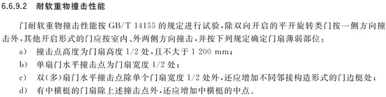 25)将门“耐撞击性能”改为“耐软重物撞击性能”,适用范围由玻璃面积占门扇面积不超过50%的平开旋转类门扩展到各类开启形式的门(见5.6.11.3,2008年版的5.6.10),并在该性能试验方法中增加了门扇受撞击方向和撞击点的规定(见6.6.9.2);