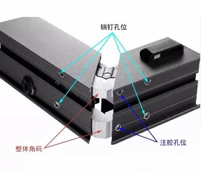 提到销钉注胶,其实是两个不同的概念,销钉是一个配件,而注胶是一种工艺流程,要了解这两个概念,首先我们要科普一下窗的链接紧固方式,窗框和窗扇,都是由四个边组成,而四边型材的链接紧固件称之为角码(还有些小低端加工厂采用螺丝链接),按照窗的工艺水平的不同,角码分为活动角码和整体角码。