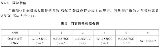 20)将“遮阳性能及其分级(遮阳系数)”改为“隔热性能及其分级(太阳得热系数)”,并规定了隔热型门窗最低要求的太阳得热系数SHGC值(见5.6.6,2008年版的5.6.6);