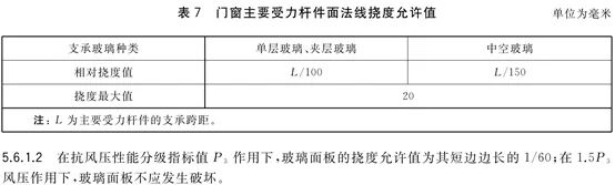 【解读】: 根据铝合金门窗产品特点及多年来的实际情况,门窗宽、高由原来的“实体内侧尺寸”即槽口尺寸改为“实体外侧尺寸”即外形尺寸,检测时操作简单方便可行。增加“对角线尺寸差”以适应整窗、整扇出厂检测或抽检的整窗成品检测情况,有利于产品组装质量控制。 15)修改了抗风压性能要求,并增加了“在1.5P3风压作用下主要受力杆件不应出现危及人身安全的损坏”要求、“在抗风压性能分级指标值P3作用下,玻璃面板的挠度允许值为其短边边长 的1/60 ;在1.5P3风压作用下,玻璃面板不应发生破坏”的要求(见5.6.1,2008年版的5.6.1);