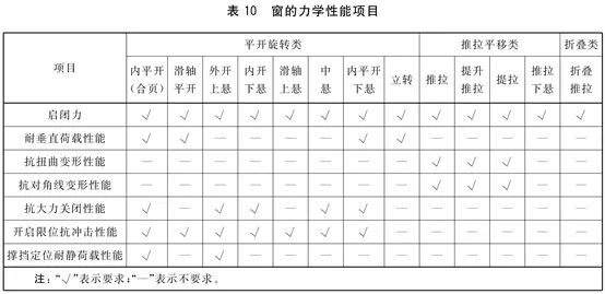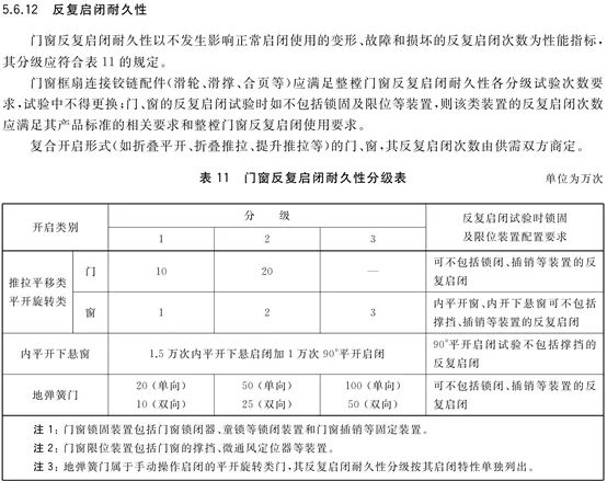【解读】: 表9、表10,分别与表2门的开启形式品种、表3的开启形式品种相对应,根据门、窗的开启形式和使用特点确定其力学性能要求。按照铝合金门窗的窗型特点实际情况贯彻了GB/T 9158-2015《建筑门窗力学性能检测方法》。 27)将“反复启闭性能”改为“反复启闭耐久性”(见5.6.12,2008年版的5.6.9),并增加了“门 窗反复启闭耐久性能分级”要求(见表11);