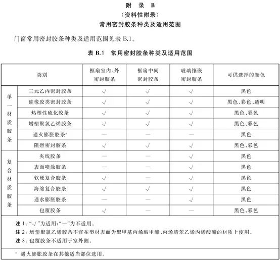 【解读】: 根据GB/T 20001.10-2014《标准编写规则 第10部分:产品标准》的编写规定,修改了本条文。 建筑门窗是设计使用年限长达几十年的重要部件,为加强门窗的质量安全信息化管理,根据2017年我国最新发布的标准GB/T 33993-2017《商品二维码》,按照门窗产品特点,本标准送审稿增加了第8.3的规定:“宜采用二维码对每樘门窗产品进行标识,使用户可通过扫描二维码获取产品标志、产品随行文件等信息;产品二维码标记应具有永久性,满足门窗产品的质量、安全问题等追溯性要求;二维码的数据结构、信息服务和符号印制质量要求应符合GB/T 33993的规定。 35) 增加了资料性附录B常用密封胶条种类及适用范围。