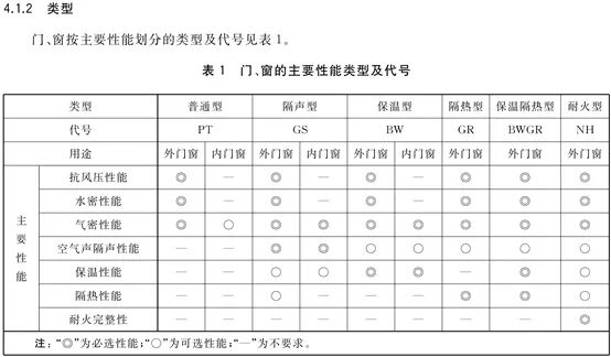 【解读】: 本标准中采用隔热性能取代原遮阳性能,门窗隔热性能在现行标准中尚无术语及定义。由于门窗的冬季断热保温与夏季遮阳隔热很容易混淆,为便于对比说明便于理解,故同时增加门窗保温性能和隔热性能术语及定义。新制定的行业标准JC/T 2304-2015 《建筑用保温隔热玻璃技术条件》也将建筑玻璃分为保温型玻璃、隔热型玻璃、保温隔热型玻璃。GB 50016-2014《建筑设计防火规范》对门窗的要求给出了”门窗耐火完整性”的术语和定义,但尚无耐火型门窗的术语和定义,故本标准增加了耐火型门窗。“反复启闭耐久性“,即是指门窗开启部分的机械耐久性,不包括门窗材料及其表面处理层在环境中的腐蚀或锈蚀耐久性。 5) 将“门、窗按使用功能划分的类型和代号”改为“门、窗按主要性能划分的类型和代号”,将2008年版的表1和表2合并为表1,其中将“遮阳型”改为“隔热型”,并增加了“保温隔热型”和“耐火型”(见4.1.2,表1,2008年版的4.1.2、表1和表2);