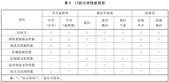 【解读】: 本标准2008版该项内容基本是参照日本JIS A 4702:2000 《门》的相关内容确定的:该项性能只对玻璃占门扇面积不超过50%的平开旋转类门适用,“30 kg砂袋170mm高度落下,撞击锁闭状态的门扇把(拉)手处1次,未出现明显变形,启闭无异常,使用无障碍,除钢化玻璃外,不允许有玻璃脱落现象”。有一点不同,即日本标准中撞击后,门玻璃的破损不作为判定事项。本次修订,再次对JIS A 4702:2015 《门》对该项性能要求的制定背景的研究,以及对铝合金门耐撞击性能的实际执行情况的调研,本标准最终基于各类开启形式的门都应保证在人体撞击后的人身安全的原则,确定的门耐软重物撞击性能的要求大大严于日本标准的规定:(1)适用范围扩展到各类开启形式的门(2)30Kg砂袋下落高度由原来170mm一个指标,扩展到100~950mm范围的六个等级指标(3)增加了玻璃方面的判定:“玻璃面板不应脱落,除钢化玻璃外,不允许有玻璃破坏”(4)在试验方法中增加了确定门扇薄弱部位撞击点的具体规定。 26)增加了“抗扭曲变形性能、抗对角线变形性能、抗大力关闭性能、开启限位抗冲击性能、撑挡定位耐静荷载性能”等力学性能要求(见表9、表10及5.6.11.6~5.6.11.10);