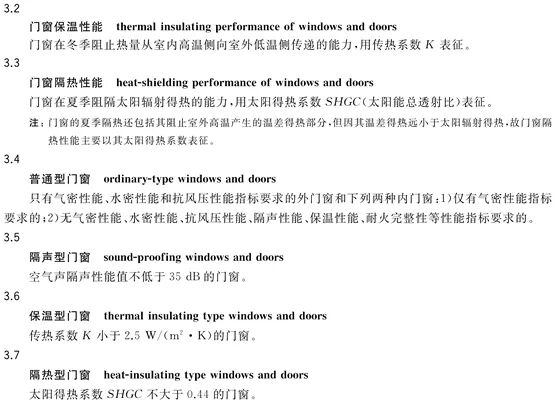 1) 第1章范围中增加了“本标准不适用于防爆门窗”(见第1章); 本标准规定了铝合金门窗的分类和标记、要求、试验方法、检验规则、产品标志及随行文件、包装、运输和贮存。 本标准适用于手动启闭操作的建筑外墙和室内隔墙用窗和人行门,以及垂直屋顶窗。本标准不适用于天窗、非垂直屋顶窗、卷帘门窗和转门,以及防火门窗、防爆门窗、逃生门窗、排烟窗、防射线屏蔽门窗等特种门窗。 【解读】: 防爆门窗是具有防爆炸冲击波性能的门窗。本标准不适用于防爆门窗,则本标准的产品不需执行GB/T29908-2013 《玻璃幕墙和门窗抗爆炸冲击波性能分级及检测方法》。 2) 第1章范围中删除了“非手动启闭操作的墙体用门、窗以及垂直天窗可参照使用”(见2008年版第1章); 【解读】: 根据标准编写要求,标准自身不再规定哪些产品可参照使用,由相关产品使用方自行分析和确定本标准是否适用其它产品。 3) 删除了“遮阳性能”“遮阳系数”“型材截面主要受力部位”的术语和定义(见2008年版的3.2、3.3、3.7); 【解读】: 采用国际上通行的方法,本标准采用太阳得热系数代替遮阳系数作为衡量透光围护结构(门窗或透光幕墙)热工性能的参数。故删除了“遮阳性能”和“遮阳系数”。按照国标GB/T 5237-2018《铝合金建筑型材》关于型材横截面尺寸的壁厚尺寸和非壁厚尺寸的规定,已经可以满足本标准对门窗主型材壁厚控制描述的需要,可以按照铝材生产行业的习惯用语,不必由门窗行业标准另行定义,实现铝材标准和门窗标准的协调统一。 4) 增加了门窗保温性能、门窗隔热性能、普通型门窗、隔声型门窗、保温型门窗、隔热型门窗、保温隔热型门窗、耐火型门窗、门窗反复启闭耐久性的术语和定义(见3.2~3.10);