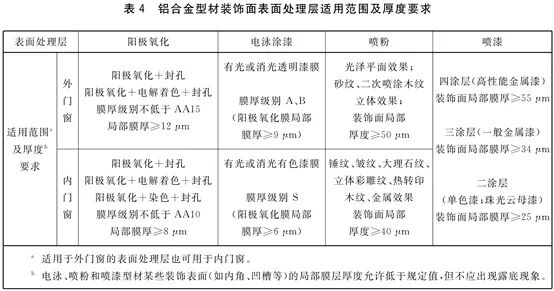 【解读】: 本标准采用GB/T 5237.1-2017《铝合金建筑型材第1部分:基材》规定的公称壁厚加尺寸偏差精度等级的方案控制门窗主型材壁厚:“外门不应小于2.2mm,内门不应小于2.0mm;外窗不应小于1.8mm,内窗不应小于1.4mm。有装配关系的门窗主型材基材壁厚公称尺寸允许偏差应采用GB/T 5237.1规定的超高精级;有装配关系的门窗主型材基材非壁厚尺寸允许偏差宜采用GB/T 5237.1规定的超高精级”。 与原来2008年版的最小实测壁厚规定比较,外门的的最小实测壁厚为2.07mm,提高幅度为3.5%;外窗的最小实测壁厚为1.7mm,提高了0.3mm,提高幅度为21%。本标准与2008年版相比还增加了内门窗型材基材壁厚和尺寸偏差精度等级要求。 8) 将“铝合金型材表面处理层厚度要求”改为“铝合金型材装饰面表面处理层适用范围及厚度要求”,并按外门窗和内门窗分别规定表面处理层适用范围及厚度要求(见表4,2008年版的表5);