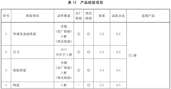 【解读】: 对于具有耐火完整性要求的保温型窗,首先应具备日常使用所需的保温性能,在此基础上满足耐火完整性要求,因此第6.7条规定“当建筑门窗同时具备保温型和耐火型要求时,应在同一樘试件上按保温性能和耐火完整性的顺序进行性能测试”。 29)增加了“表12 产品检验项目”,其中分别列出产品出厂检验和型式检验的所有项目及相应的抽样试件数量(见7.1.1);