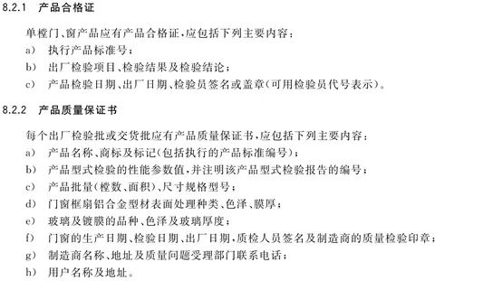 30) 修改了门窗及框扇装配尺寸偏差检验的组批与抽样规则(见7.2.1.2,2008年版的7.2.1.2); 7.2.1.2 门窗及框扇装配尺寸偏差检验,每100樘为一个检验批,不足100樘也为一个检验批。从每个检验批中按不同类型、品种、系列、规格分别随机抽取5%且不少于3樘。 31)修改了型式检验组批与抽样规则(见7.3.2,2008年版的7.3.2); 7.3.2 组批与抽样规则 从不少于100樘的出厂检验合格批中任选一批作为型式检验批,按表12规定的试件数量随机抽取。 32)删除了“产品合格证书”(见2008年版的8.2);增加了“产品合格证”和“产品质量保证书”(见8.2.1、8.2.2);